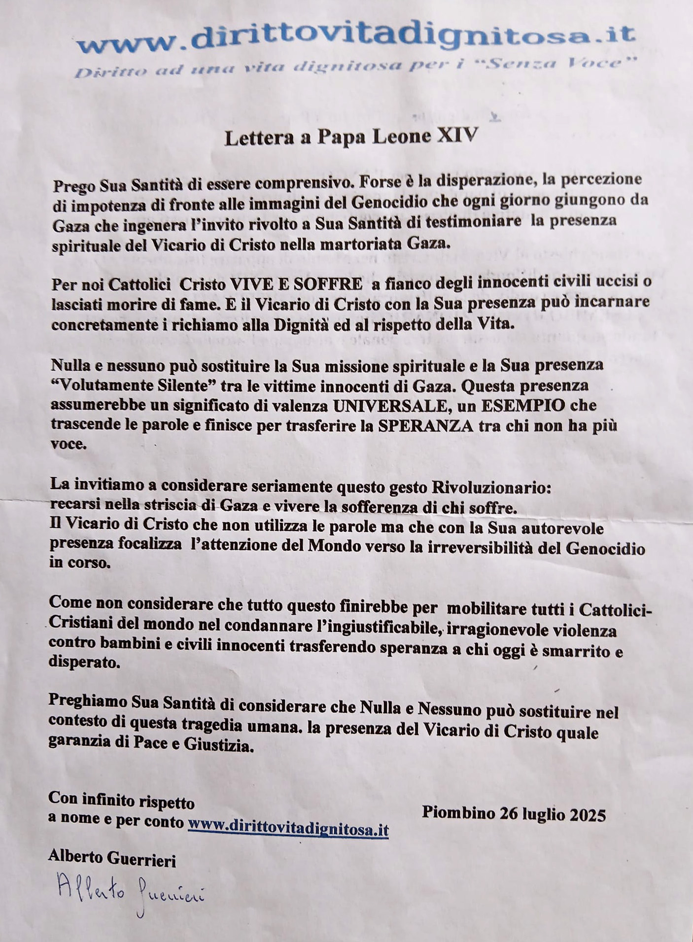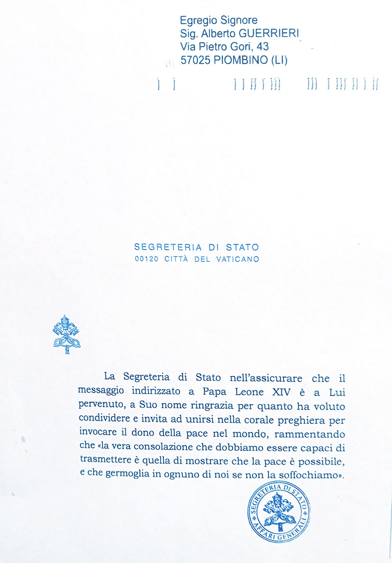 Lettera inviata a Papa Leone XIV in data 26 Luglio 2025