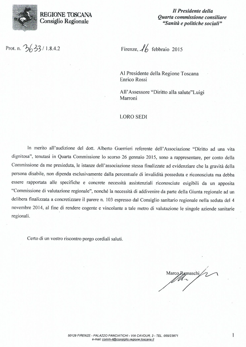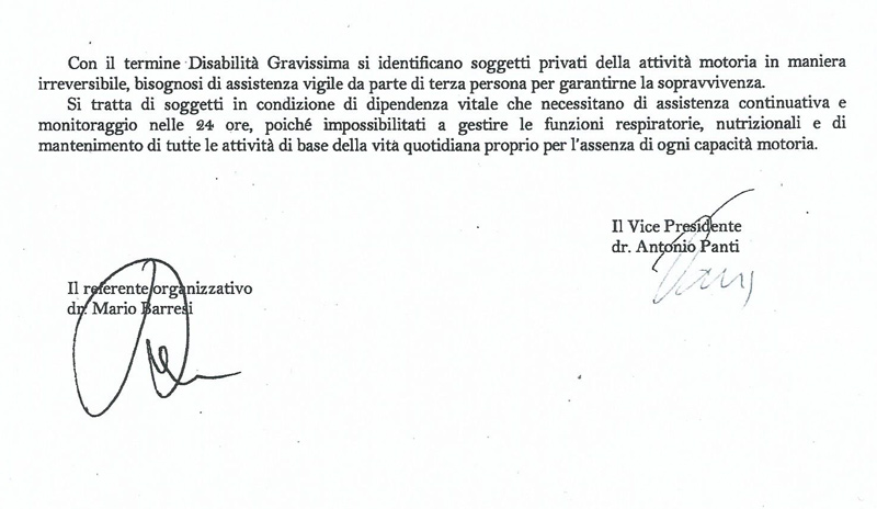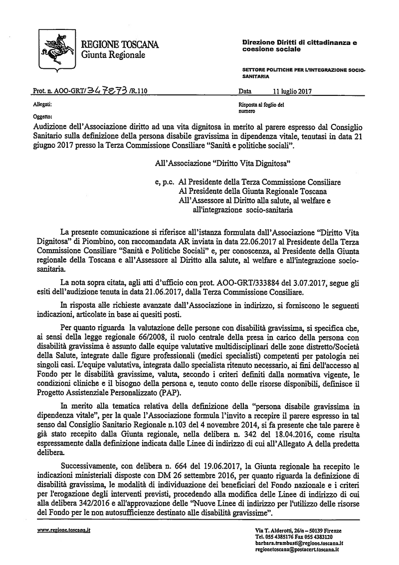 - In conformità alla regola della TRASPARENZA, rendere noto il numero certo e verificato, di Persone Disabili Gravissime in Dipendenza Vitale, riconosciute tali, assistite e residenti nella Regione Toscana anno 2015 e 2016. Quanto sopra nel solco della lettera del novembre 2014 indirizzata all’allora Pres. Consiglio, Matteo Renzi, al Ministro della Salute, Beatrice Lorenzin ed al Pres. Regione Toscana , Enrico Rossi / ALL.3.