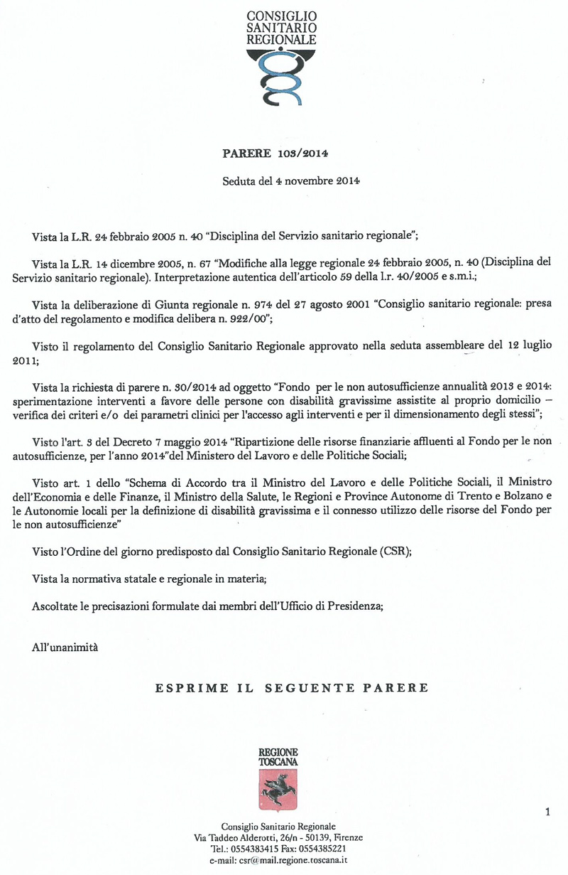 Ne consegue il particolare interesse riferito al PARERE 103/2014, espresso dal Consiglio Sanitario Regionale, nella Seduta del 4 novembre 2014, in relazione al termine Disabilità Gravissima / ALL.3 e 4.