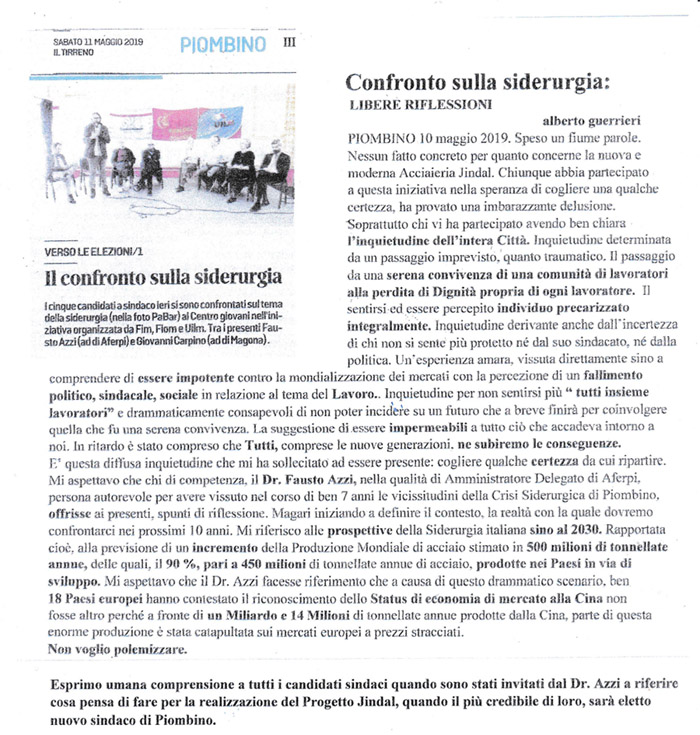 “Il Signor Podestà”. Poiché i risultati sono sotto gli occhi di tutti, si rende necessario conoscere quali valutazioni, quali strategie, quali azioni siano state considerate ed intraprese per evitare una prevedibile perdita di posti di lavoro nel settore Siderurgico, con inevitabili ripercussioni Sociali in tutta la Val di Cornia.