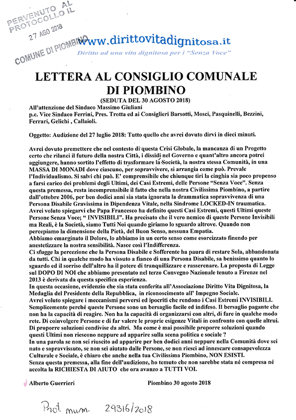 " Alberto Guerrieri è intervenuto il 27 luglio scorso in Consiglio Comunale a Piombino per contestare l'indifferenza dell'Amministrazione e della Città nei confronti di una Persona Disabile Gravissima in Dipendenza Vitale che dopo Dodici anni, evidenzio "Dopo Dodici Anni" non è stata ancora inserita in un Progetto che trasferisca a questa Persona la certezza di non essere abbandonato Dopo la morte dei Genitori. Si finge di ignorare l'ansia di Chiunque si proietti nelle drammatiche realtà del DOPO DI NOI, quando cioè dovranno sopravvivere senza il conforto fisico ed affettivo dei Genitori.