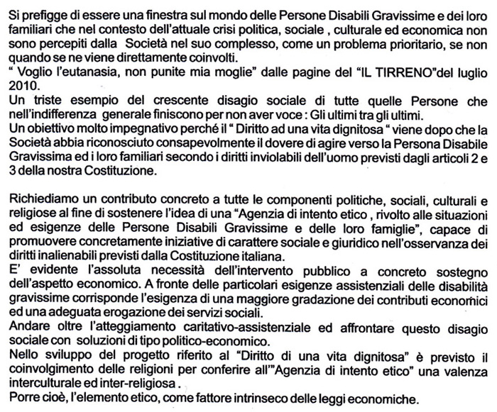 Il “Diritto ad una Vita dignitosa” è un movimento associativo riferito esclusivamente alla soluzione delle difficili problematiche esistenziali delle Persone Disabili Gravissime e dei loro familiari.