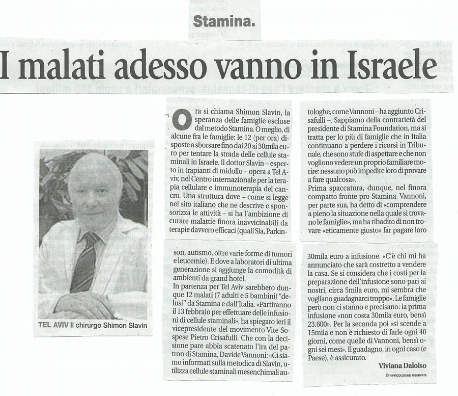 In una audizione della Comunità Scientifica, il Gruppo Vannoni ha proposto un trattamento Stamina, nella forma Compassionevole. Se passa la linea del trattamento Compassionevole, allora si potrà sostenere che qualsiasi iniziativa è per un trattamento compassionevole. Qualcuno allora potrà proporre l’olio di serpente, i fiori , la musica classica, un altro non so che cosa pur di sostenere che sia un trattamento compassionevole, sottraendosi al vincolo che i trattamenti compassionevoli sono definiti molto precisamente. Nell’ambito delle Agenzie che regolano questi trattamenti, il trattamento compassionevole deve già aver superato una fase di controllo, che deve aver dimostrato almeno in qualche altra condizione di essere sicuro, efficace in qualche specifica condizione. Tutto questo per verificare se produce un qualche cambiamento della situazione clinica. Non l’uso vago, indefinito di trattamento compassionevole. E’ una trappola che gli organi d’informazione non hanno saputo comunicare in modo netto e chiaro. Comunque sia, la questione Stamina è stata gestita molto meglio del caso Di Bella. Nel caso Stamina gli Organi d’informazione sono stati molto più prudenti. Questa volta gli errori sono maggiormente imputabili alla classe politica anche se certa stampa ha come dire speculato sulla sofferenza, dando largo spazio alle promesse illusorie del gruppo Vannoni.