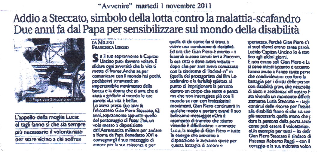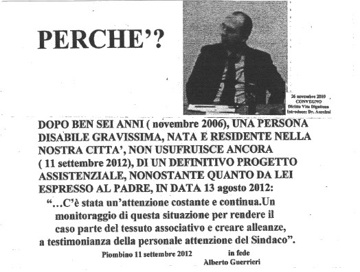 Nella condivisione di queste parole, proponiamo due diversi esempi di SOLIDARIETA' SOCIALE, riferiti a Persona Disabile Gravissima, ma l'una residente nella Città di Piacenza/ Sindaco Dr.Roberto Reggi, e l'altra, residente a Piombino (LI) / Sindaco Dr. Gianni Anselmi: