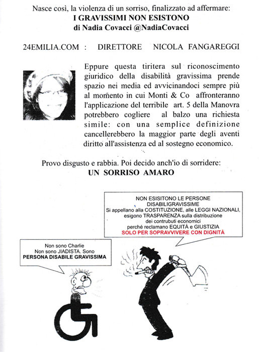 Un fattore, questo, tutt'altro che secondario dal momento che temi sensibili e importanti come quello della disabilità sono spesso considerati di “nicchia” e costretti dai media in spazi marginali. Per non sollevare un vespaio, forse al movimento di cui faccio parte sarebbe convenuto votare a favore della proposta di legge o, al massimo, astenersi. Ma la convenienza non è la ragione per la quale siamo entrati in Parlamento. A costo di risultare impopolare, il nostro approccio è quello di valutare nel merito ogni testo di legge: solo su quello basiamo le nostre valutazioni, a prescindere da qualsiasi tornaconto.