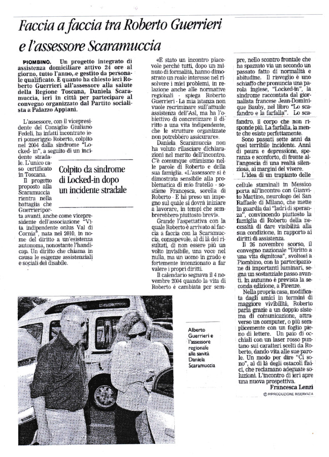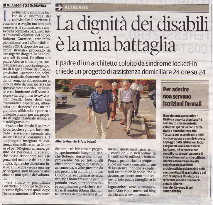 " Alberto Guerrieri è intervenuto il 27 luglio scorso in Consiglio Comunale a Piombino per contestare l'indifferenza dell'Amministrazione e della Città nei confronti di una Persona Disabile Gravissima in Dipendenza Vitale che dopo Dodici anni, evidenzio "Dopo Dodici Anni" non è stata ancora inserita in un Progetto che trasferisca a questa Persona la certezza di non essere abbandonato Dopo la morte dei Genitori. Si finge di ignorare l'ansia di Chiunque si proietti nelle drammatiche realtà del DOPO DI NOI, quando cioè dovranno sopravvivere senza il conforto fisico ed affettivo dei Genitori.